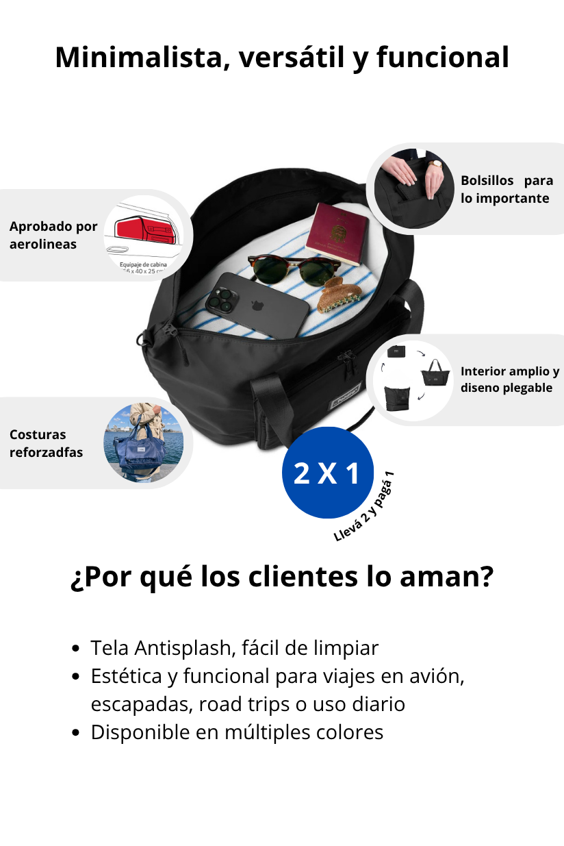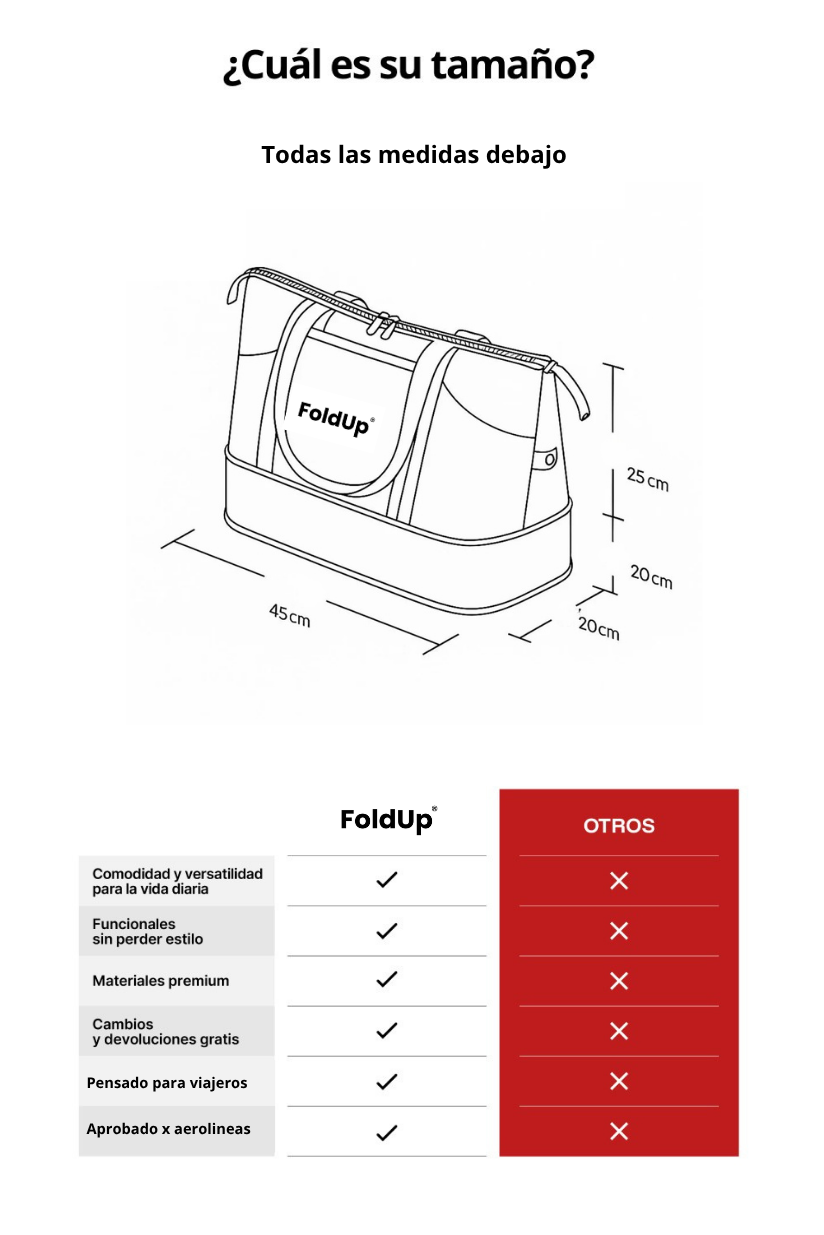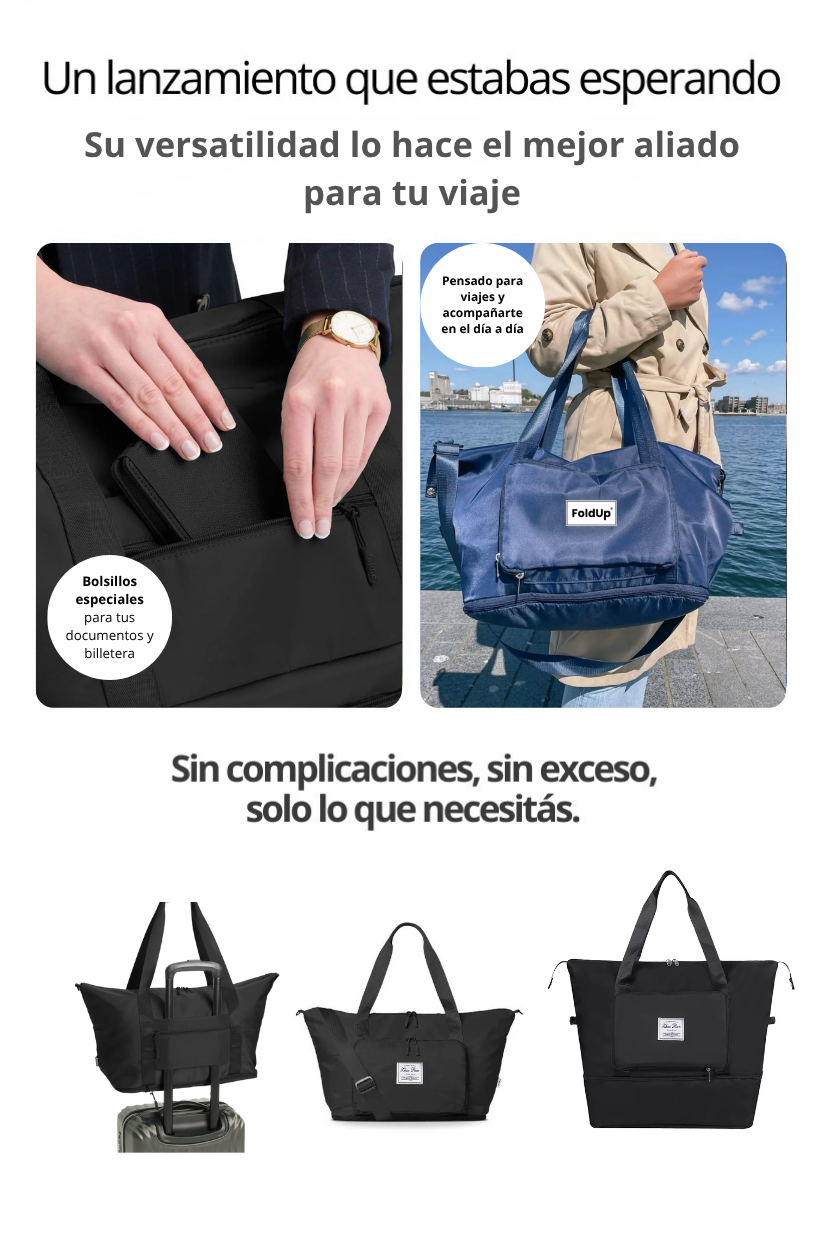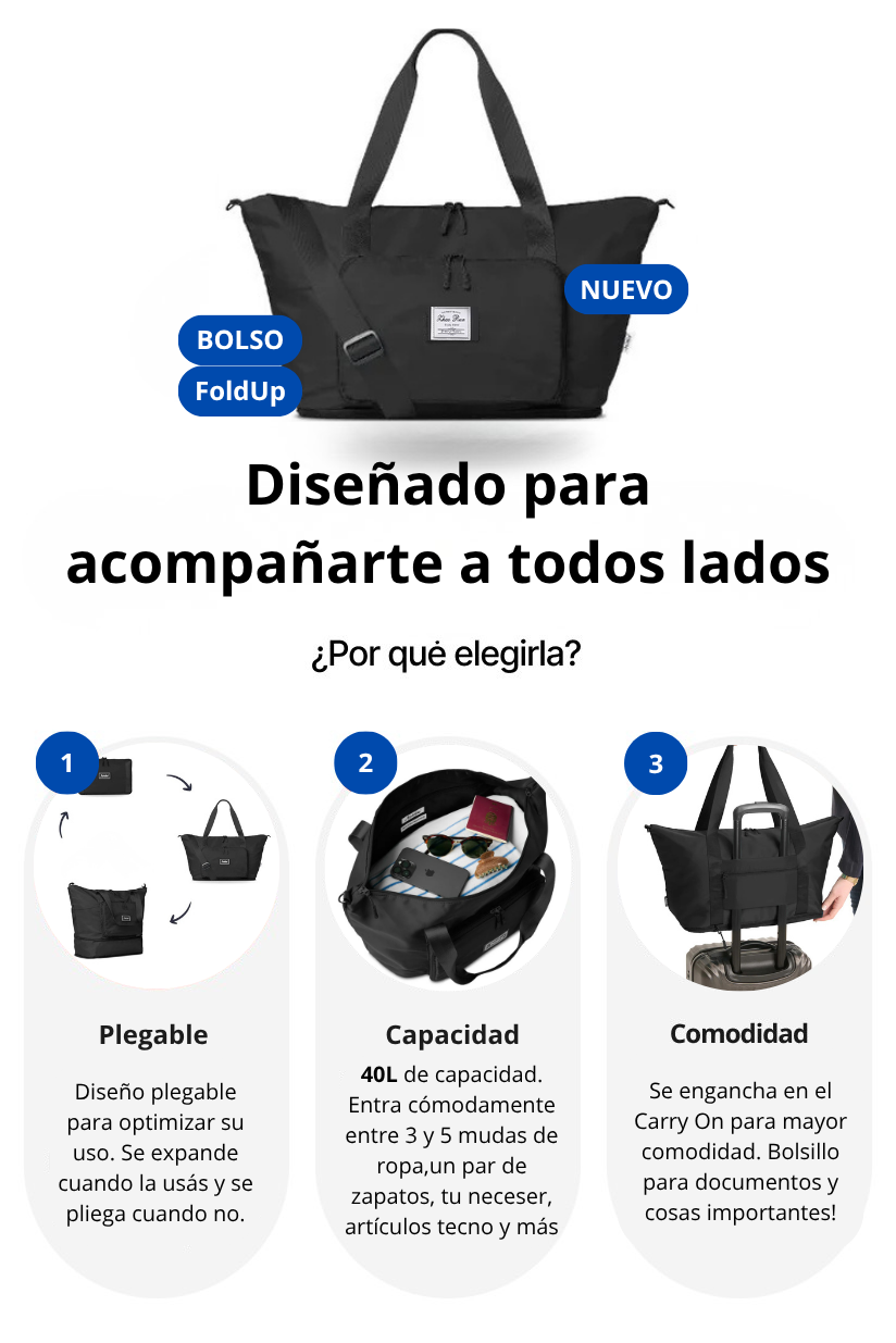 3- ¿El bolso es plegable y extensible? Si, el bolso se pliega para cuando no lo usas y optimizar estpacio. Además se expande para cuando necesitás ese lugarcito extra!