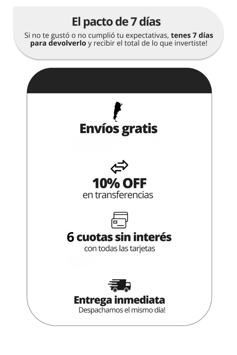 4- ¿Qué pasa si no me gusta? Contamos con el pacto de los 7 días. Si no te gusta podes devolverlo en las mismas condiciones en la que lo recibiste y te reinegramos la totalidad del dinero.